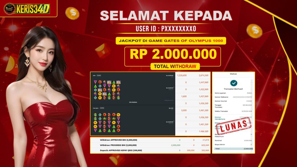 Setiap hari, member KERIS34D berhasil meraih jackpot besar dari berbagai provider slot ternama yang kami sediakan, seperti Pragmatic Play, Habanero, PG Soft, dan masih banyak lagi. Kami secara rutin menampilkan bukti screenshot atau rekapan kemenangan yang berhasil diraih, mulai dari kemenangan ratusan ribu hingga puluhan juta rupiah. Semua slip kemenangan ini kami hadirkan untuk membuktikan bahwa di KERIS34D, peluang menang itu nyata