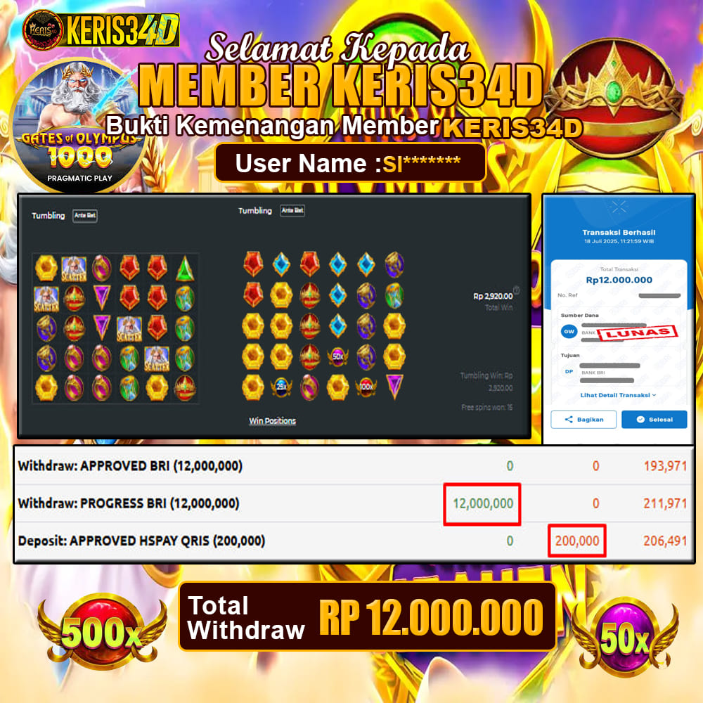 Setiap hari, member KERIS34D berhasil meraih jackpot besar dari berbagai provider slot ternama yang kami sediakan, seperti Pragmatic Play, Habanero, PG Soft, dan masih banyak lagi. Kami secara rutin menampilkan bukti screenshot atau rekapan kemenangan yang berhasil diraih, mulai dari kemenangan ratusan ribu hingga puluhan juta rupiah. Semua slip kemenangan ini kami hadirkan untuk membuktikan bahwa di KERIS34D, peluang menang itu nyata