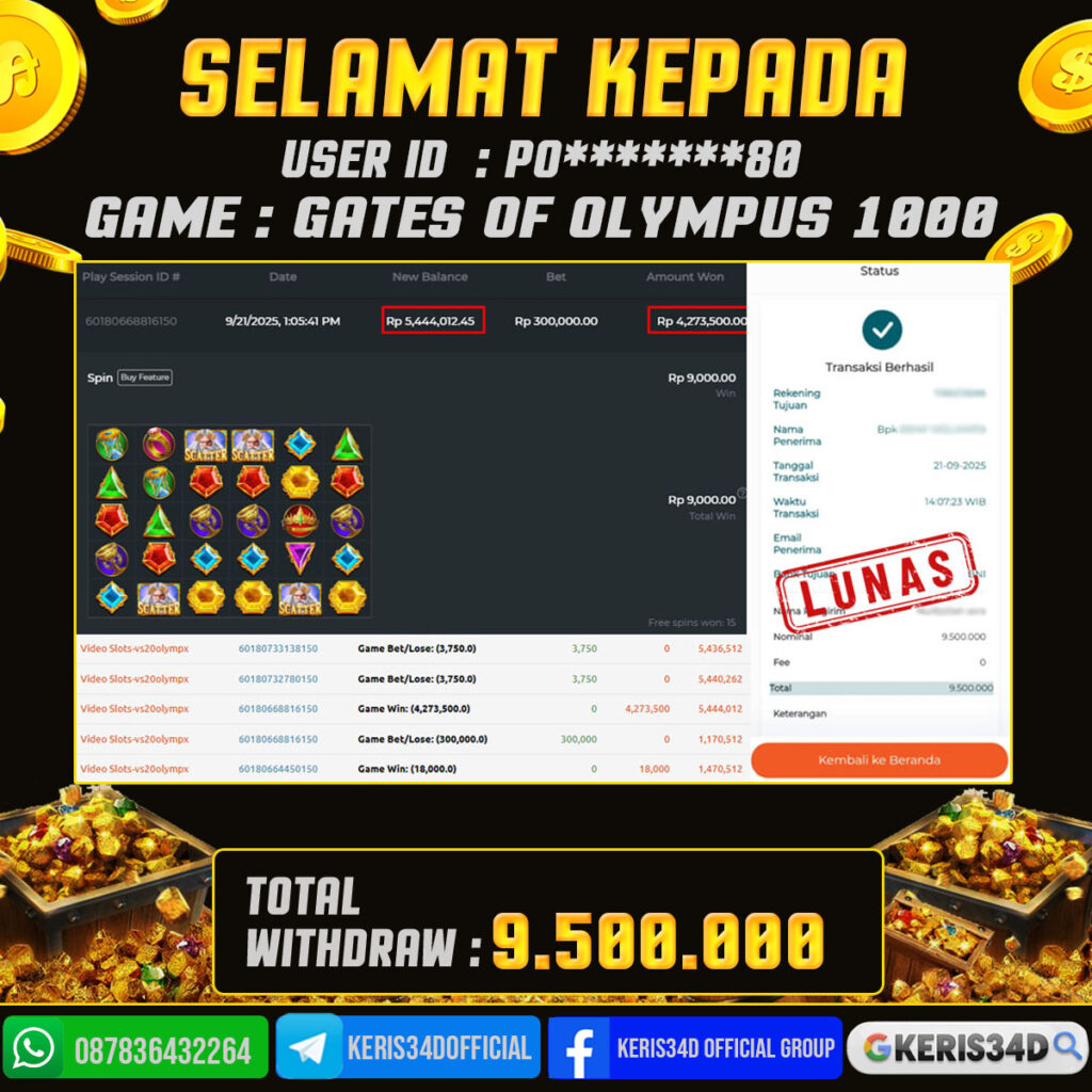 Setiap hari, member KERIS34D berhasil meraih jackpot besar dari berbagai provider slot ternama yang kami sediakan, seperti Pragmatic Play, Habanero, PG Soft, dan masih banyak lagi. Kami secara rutin menampilkan bukti screenshot atau rekapan kemenangan yang berhasil diraih, mulai dari kemenangan ratusan ribu hingga puluhan juta rupiah. Semua slip kemenangan ini kami hadirkan untuk membuktikan bahwa di KERIS34D, peluang menang itu nyata