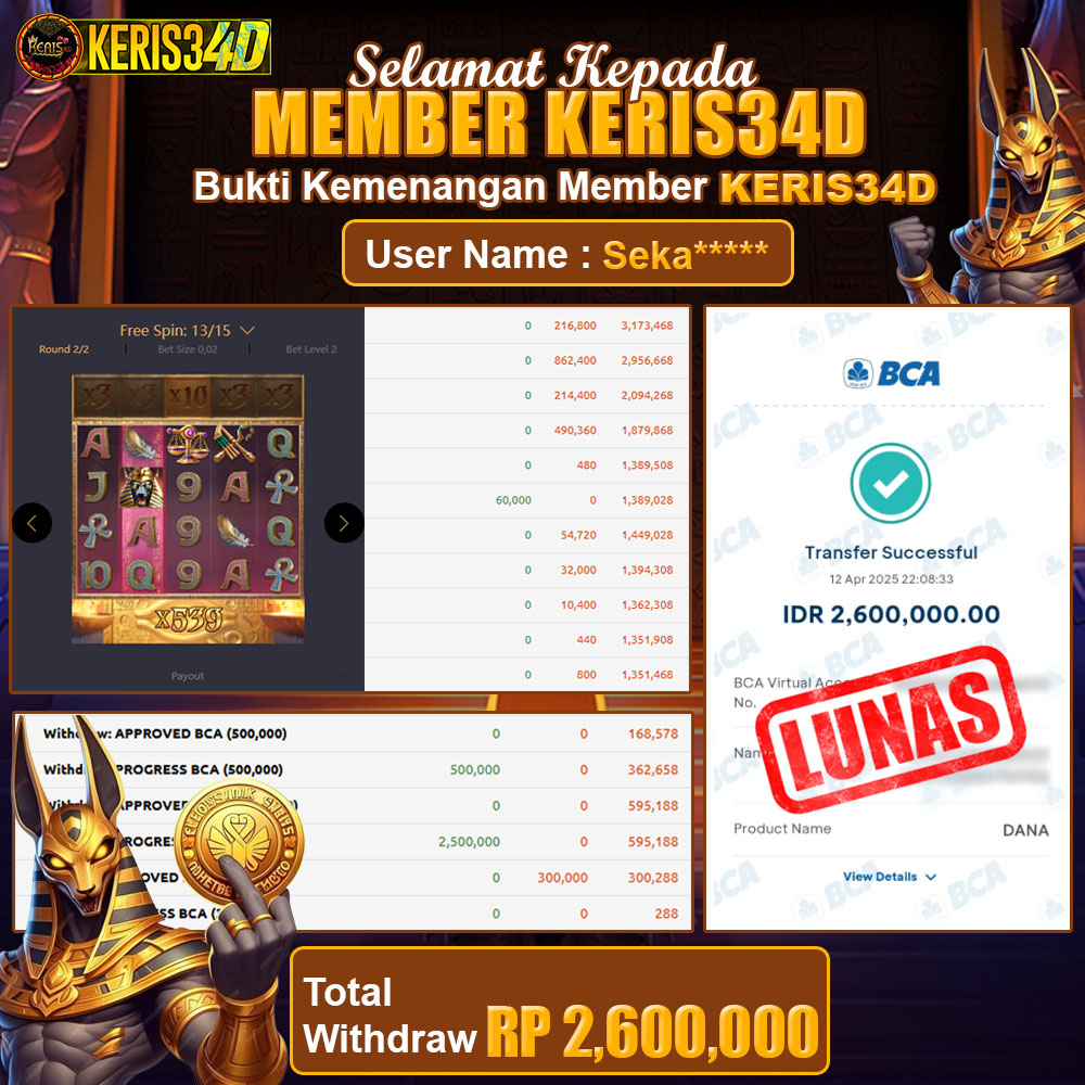Setiap hari, member KERIS34D berhasil meraih jackpot besar dari berbagai provider slot ternama yang kami sediakan, seperti Pragmatic Play, Habanero, PG Soft, dan masih banyak lagi. Kami secara rutin menampilkan bukti screenshot atau rekapan kemenangan yang berhasil diraih, mulai dari kemenangan ratusan ribu hingga puluhan juta rupiah. Semua slip kemenangan ini kami hadirkan untuk membuktikan bahwa di KERIS34D, peluang menang itu nyata
