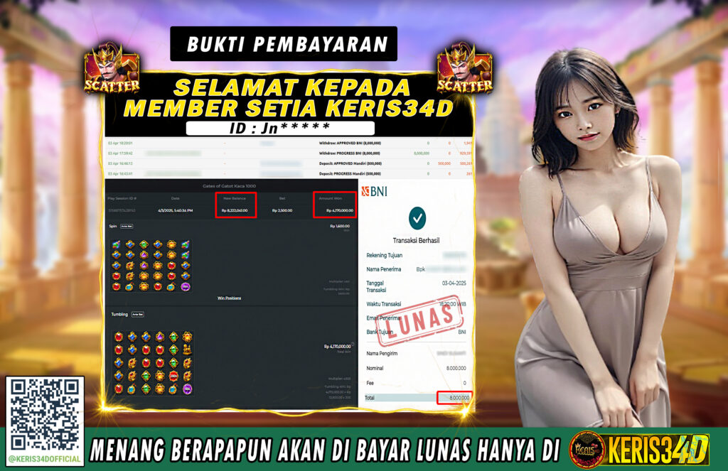 KERIS34D dikenal sebagai situs terpercaya yang selalu menghadirkan pengalaman bermain slot online yang aman, fair, dan berlisensi resmi. Di sini, kami tidak hanya sekadar memberikan janji, tapi bukti nyata berupa slip kemenangan yang dapat Anda lihat secara langsung.
