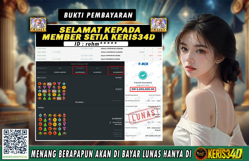 Setiap hari, member KERIS34D berhasil meraih jackpot besar dari berbagai provider slot ternama yang kami sediakan, seperti Pragmatic Play, Habanero, PG Soft, dan masih banyak lagi. Kami secara rutin menampilkan bukti screenshot atau rekapan kemenangan yang berhasil diraih, mulai dari kemenangan ratusan ribu hingga puluhan juta rupiah. Semua slip kemenangan ini kami hadirkan untuk membuktikan bahwa di KERIS34D, peluang menang itu nyata
