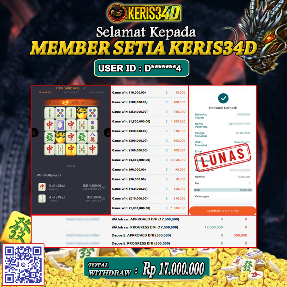 Setiap hari, member KERIS34D berhasil meraih jackpot besar dari berbagai provider slot ternama yang kami sediakan, seperti Pragmatic Play, Habanero, PG Soft, dan masih banyak lagi. Kami secara rutin menampilkan bukti screenshot atau rekapan kemenangan yang berhasil diraih, mulai dari kemenangan ratusan ribu hingga puluhan juta rupiah. Semua slip kemenangan ini kami hadirkan untuk membuktikan bahwa di KERIS34D, peluang menang itu nyata