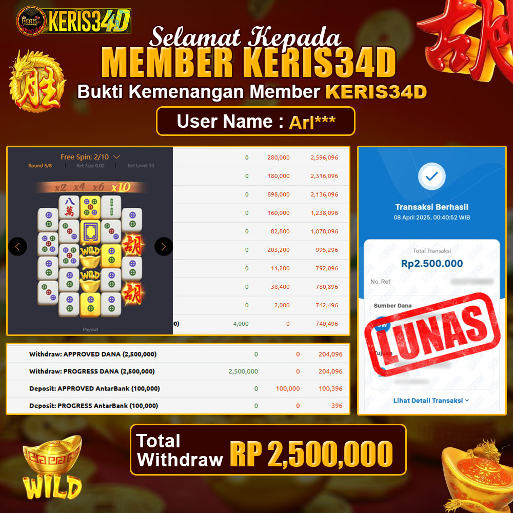 Setiap hari, member KERIS34D berhasil meraih jackpot besar dari berbagai provider slot ternama yang kami sediakan, seperti Pragmatic Play, Habanero, PG Soft, dan masih banyak lagi. Kami secara rutin menampilkan bukti screenshot atau rekapan kemenangan yang berhasil diraih, mulai dari kemenangan ratusan ribu hingga puluhan juta rupiah. Semua slip kemenangan ini kami hadirkan untuk membuktikan bahwa di KERIS34D, peluang menang itu nyata