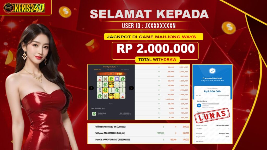 KERIS34D dikenal sebagai situs terpercaya yang selalu menghadirkan pengalaman bermain slot online yang aman, fair, dan berlisensi resmi. Di sini, kami tidak hanya sekadar memberikan janji, tapi bukti nyata berupa slip kemenangan yang dapat Anda lihat secara langsung.