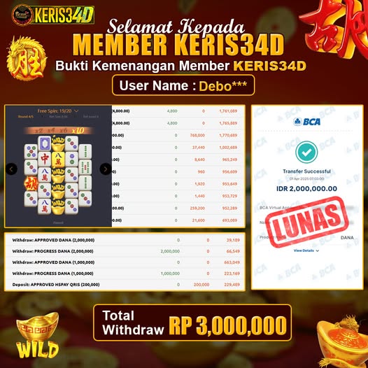 Setiap hari, member KERIS34D berhasil meraih jackpot besar dari berbagai provider slot ternama yang kami sediakan, seperti Pragmatic Play, Habanero, PG Soft, dan masih banyak lagi. Kami secara rutin menampilkan bukti screenshot atau rekapan kemenangan yang berhasil diraih, mulai dari kemenangan ratusan ribu hingga puluhan juta rupiah. Semua slip kemenangan ini kami hadirkan untuk membuktikan bahwa di KERIS34D, peluang menang itu nyata