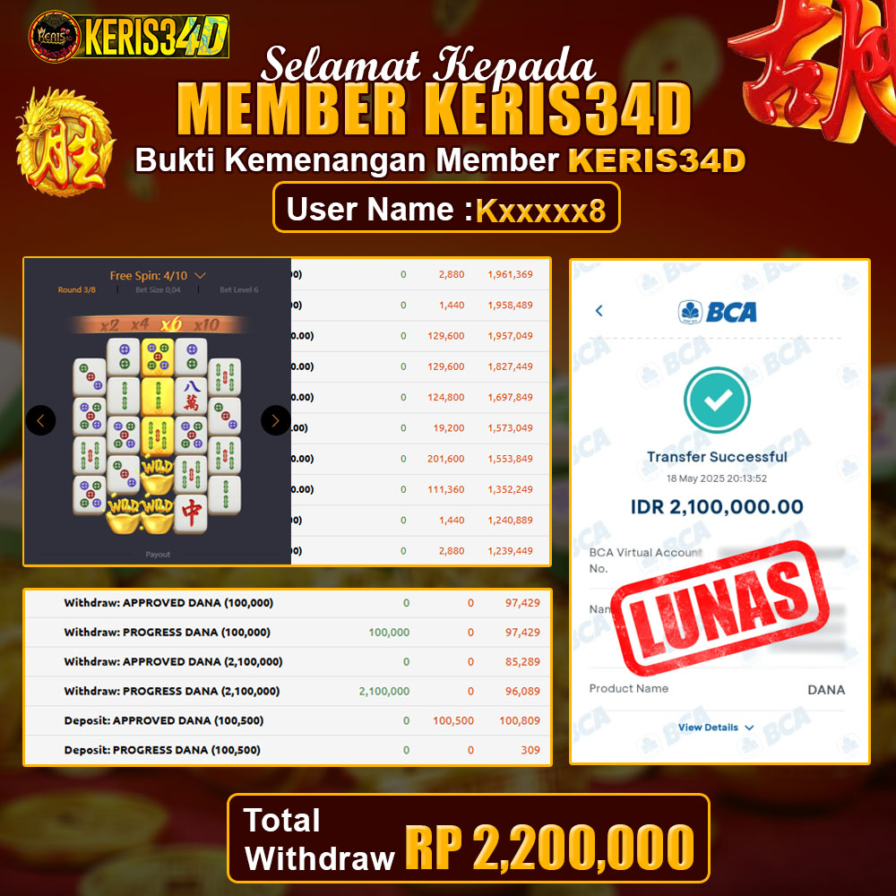 Setiap hari, member KERIS34D berhasil meraih jackpot besar dari berbagai provider slot ternama yang kami sediakan, seperti Pragmatic Play, Habanero, PG Soft, dan masih banyak lagi. Kami secara rutin menampilkan bukti screenshot atau rekapan kemenangan yang berhasil diraih, mulai dari kemenangan ratusan ribu hingga puluhan juta rupiah. Semua slip kemenangan ini kami hadirkan untuk membuktikan bahwa di KERIS34D, peluang menang itu nyata