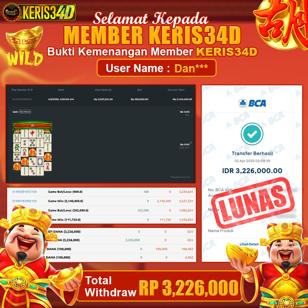 Setiap hari, member KERIS34D berhasil meraih jackpot besar dari berbagai provider slot ternama yang kami sediakan, seperti Pragmatic Play, Habanero, PG Soft, dan masih banyak lagi. Kami secara rutin menampilkan bukti screenshot atau rekapan kemenangan yang berhasil diraih, mulai dari kemenangan ratusan ribu hingga puluhan juta rupiah. Semua slip kemenangan ini kami hadirkan untuk membuktikan bahwa di KERIS34D, peluang menang itu nyata