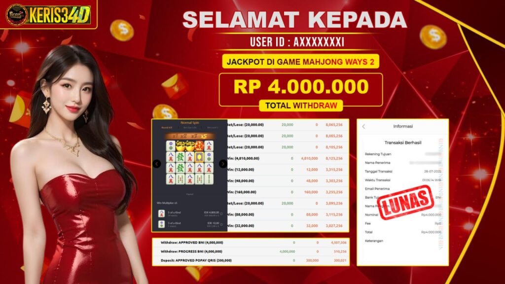 KERIS34D dikenal sebagai situs terpercaya yang selalu menghadirkan pengalaman bermain slot online yang aman, fair, dan berlisensi resmi. Di sini, kami tidak hanya sekadar memberikan janji, tapi bukti nyata berupa slip kemenangan yang dapat Anda lihat secara langsung.