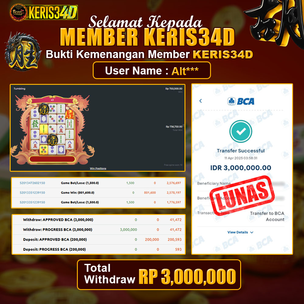 Setiap hari, member KERIS34D berhasil meraih jackpot besar dari berbagai provider slot ternama yang kami sediakan, seperti Pragmatic Play, Habanero, PG Soft, dan masih banyak lagi. Kami secara rutin menampilkan bukti screenshot atau rekapan kemenangan yang berhasil diraih, mulai dari kemenangan ratusan ribu hingga puluhan juta rupiah. Semua slip kemenangan ini kami hadirkan untuk membuktikan bahwa di KERIS34D, peluang menang itu nyata