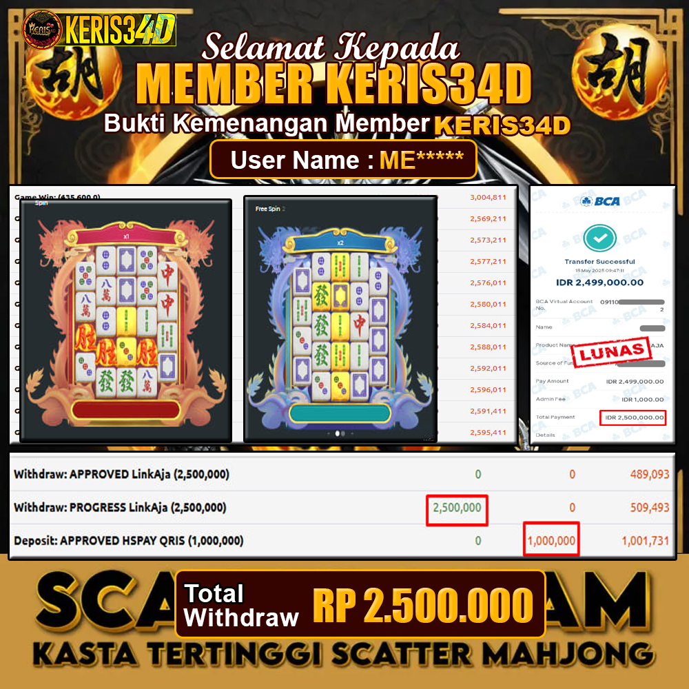 Setiap hari, member KERIS34D berhasil meraih jackpot besar dari berbagai provider slot ternama yang kami sediakan, seperti Pragmatic Play, Habanero, PG Soft, dan masih banyak lagi. Kami secara rutin menampilkan bukti screenshot atau rekapan kemenangan yang berhasil diraih, mulai dari kemenangan ratusan ribu hingga puluhan juta rupiah. Semua slip kemenangan ini kami ha