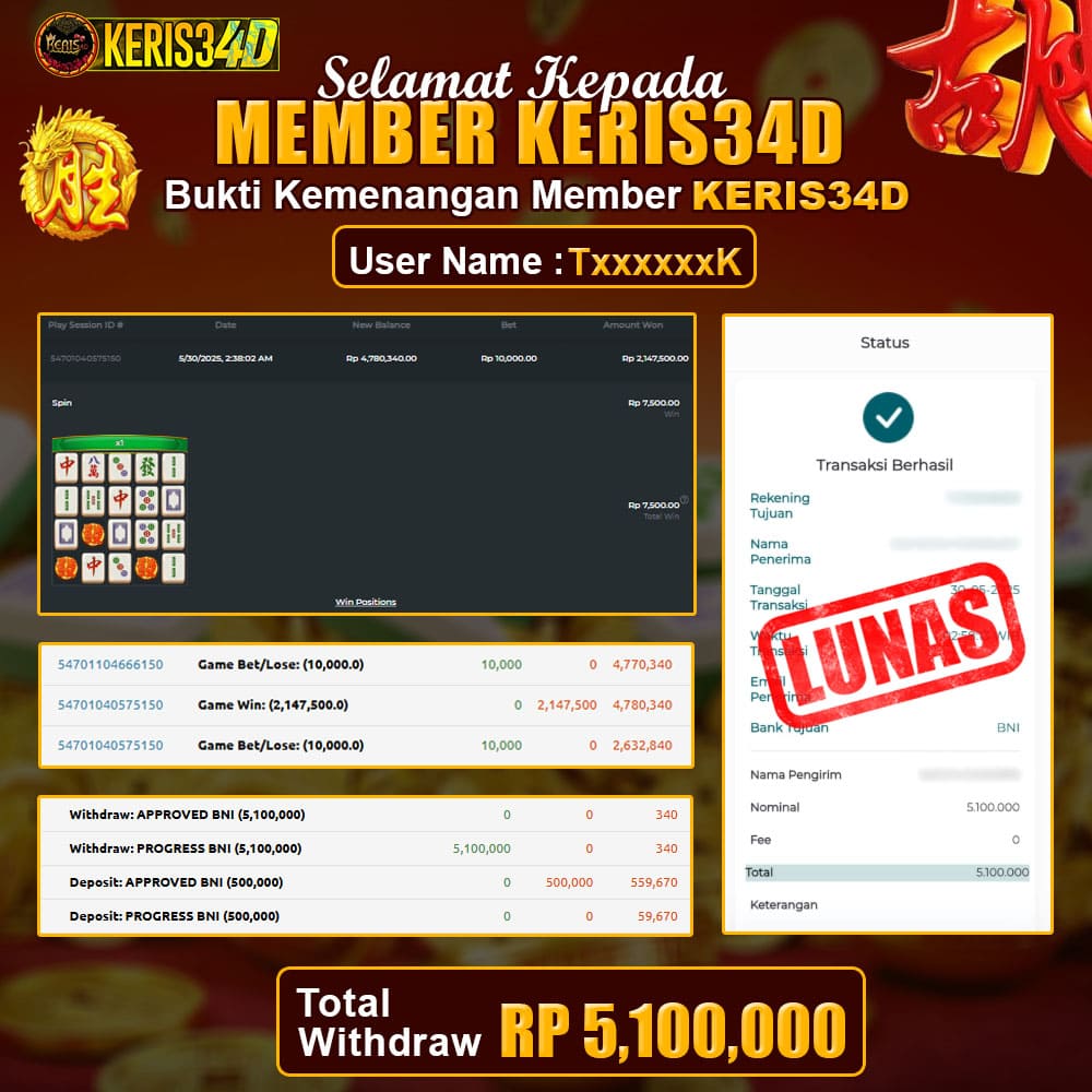 KERIS34D dikenal sebagai situs terpercaya yang selalu menghadirkan pengalaman bermain slot online yang aman, fair, dan berlisensi resmi. Di sini, kami tidak hanya sekadar memberikan janji, tapi bukti nyata berupa slip kemenangan yang dapat Anda lihat secara langsung.