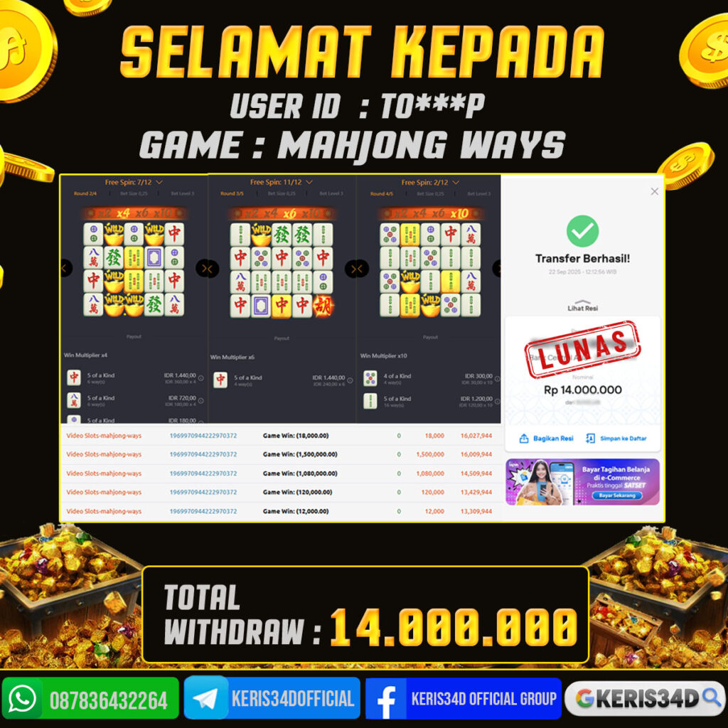 Setiap hari, member KERIS34D berhasil meraih jackpot besar dari berbagai provider slot ternama yang kami sediakan, seperti Pragmatic Play, Habanero, PG Soft, dan masih banyak lagi. Kami secara rutin menampilkan bukti screenshot atau rekapan kemenangan yang berhasil diraih, mulai dari kemenangan ratusan ribu hingga puluhan juta rupiah. Semua slip kemenangan ini kami hadirkan untuk membuktikan bahwa di KERIS34D, peluang menang itu nyata
