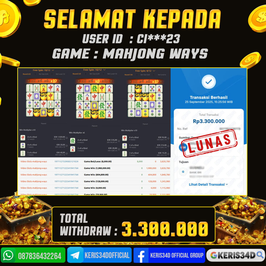 JACKPOT SLOT GACOR MAIN MAHJONG WAYS 25 SEPTEMBER 2025, Jackpot Slot Gacor, Kemenangan Slot, Bukti Kemenangan Slot, Kemenangan PGSOFT, Menang Slot online, Slot Gacor, Situs Aman Terpercaya, WD Berapapun Pasti DI Bayar Tuntas, Maxwin Slot Online.